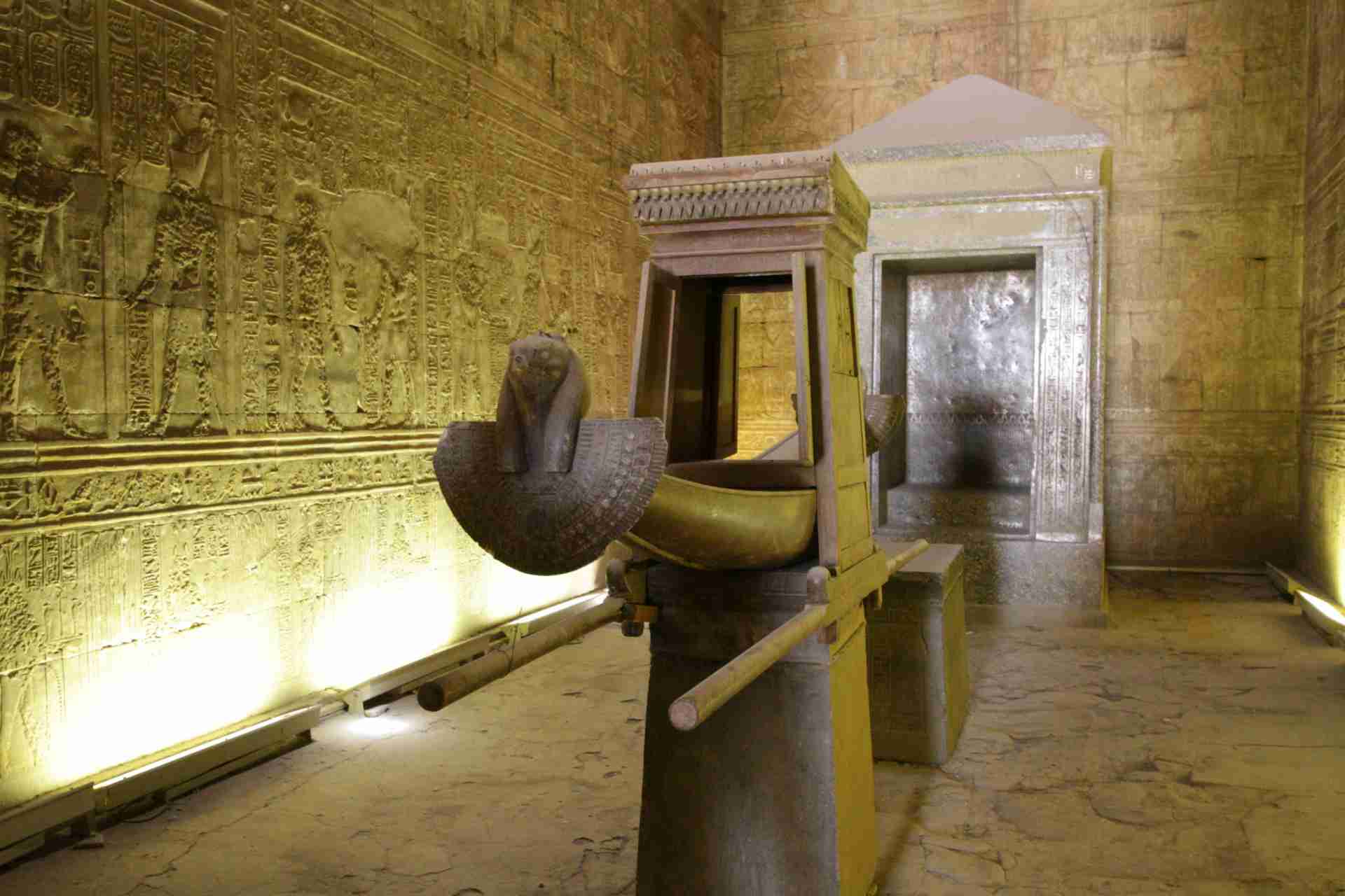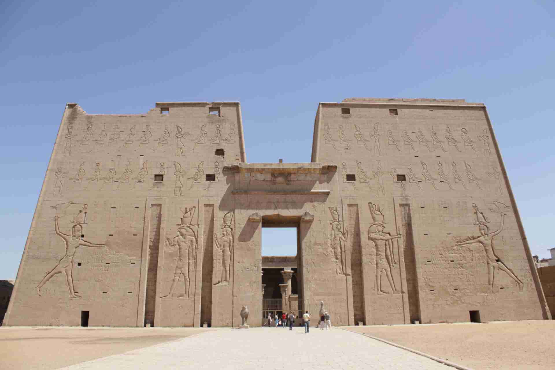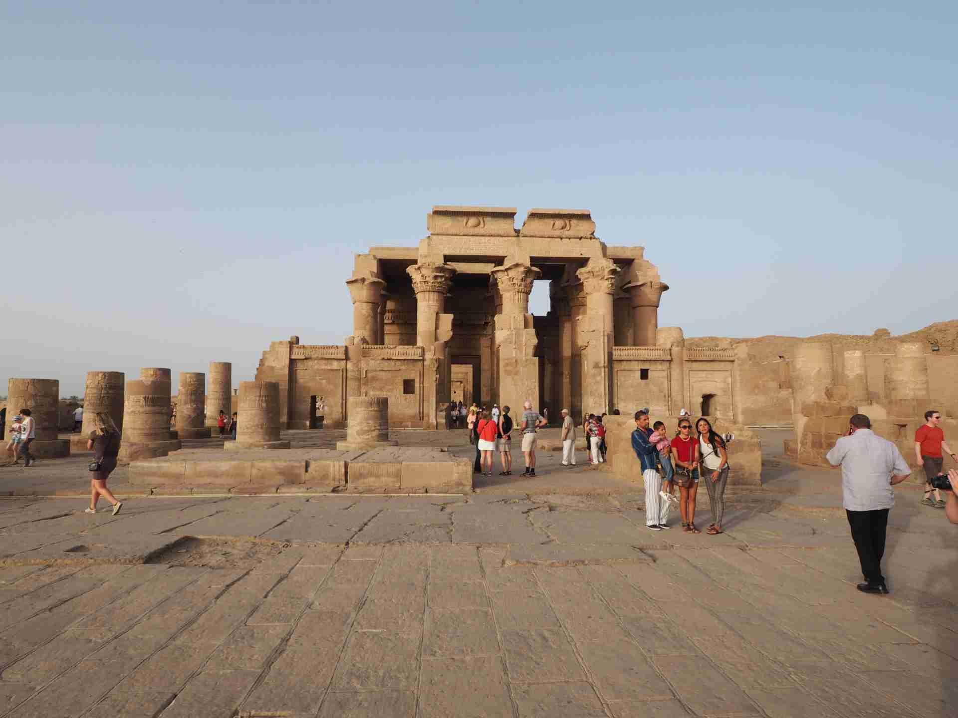 Noch während wir schlafen trägt uns unser Schiff weiter nach Edfu. Der Tempel hatte bereits im Alten Reich als Kultstätte zu Ehren des Falkengottes Horus große Bedeutung. Bis zum heutigen Tag ist die Anlage in nahezu perfekter Architektur erhalten. Entlang eines besonders schönen Nilabschnitts schippern wir heute Nachmittag bis nach Kom Ombo. Am nahen Ufer tauchen abwechselnd grüne Inseln mit grasenden Kühen, Obst-Plantagen und kleine Dörfer auf.
