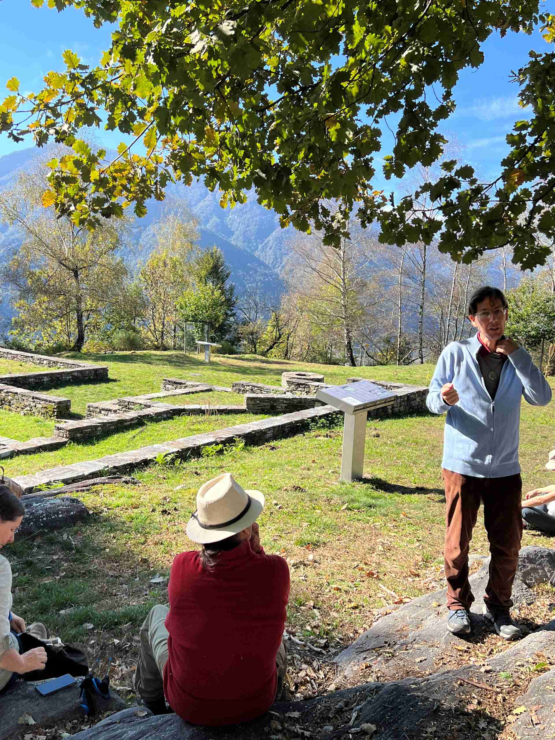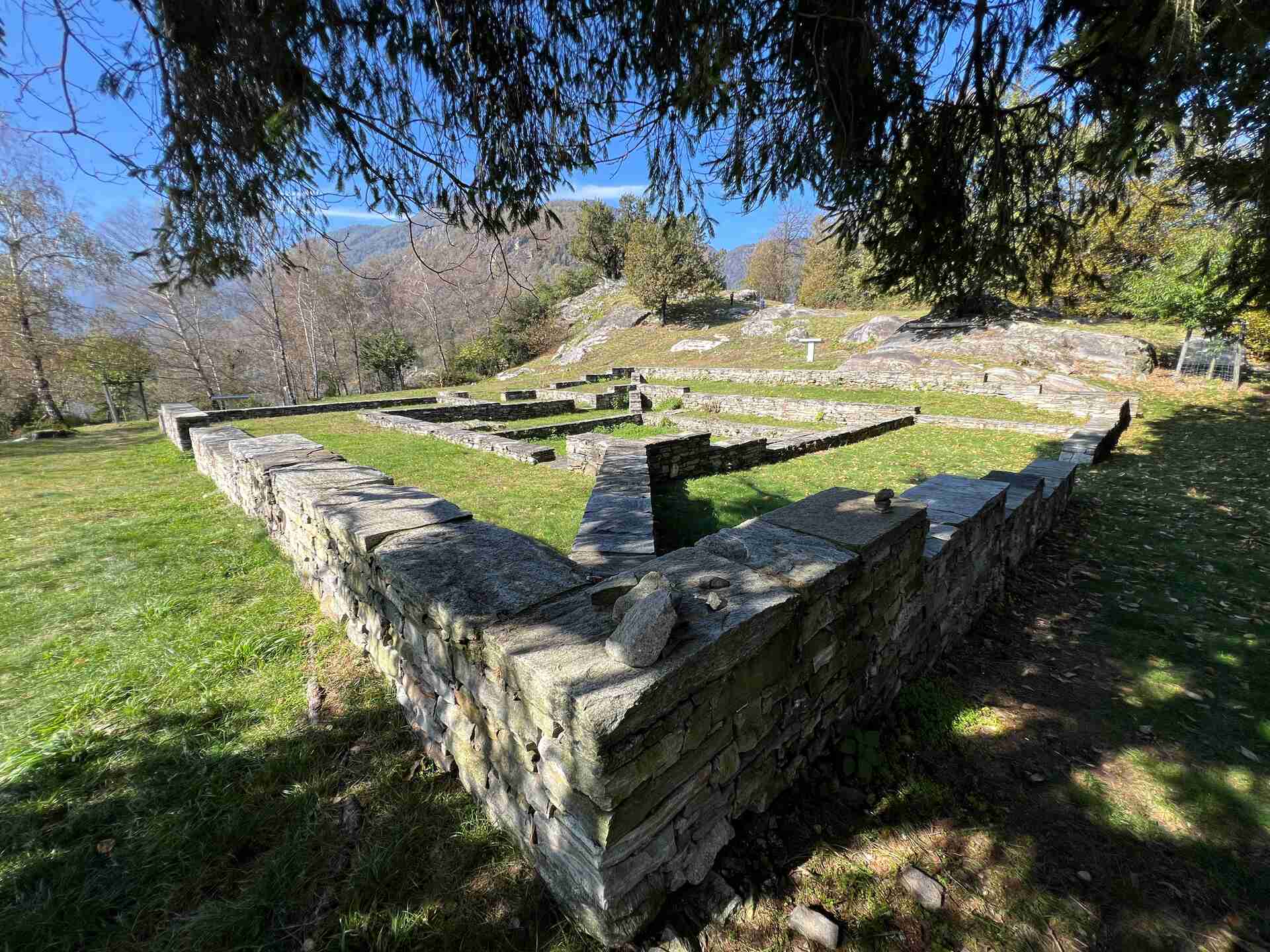 Wir besuchen die keltisch-römische Tempelruine Rovine del Castelliere. Bis heute sind die Grundrissmauern der Hauptanlage im Stil eines keltischen Vierecktempels zu sehen. Historiker deuten die Anlage als Reste einer Druidenhütte, auf deren Mauern später ein mittelalterlicher Turm erbaut wurde.
