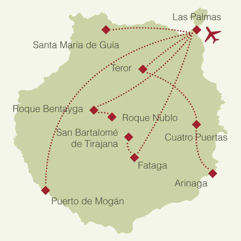 Über Arucas fahren wir zunächst nach Teror, der spirituellen Hauptstadt von Gran Canaria, wo wir der berühmten Marien-Basilika Virgen del Pino einen Besuch abstatten. Unser nächstes Ziel ist Cuatro Puertas, wo sich auf einem 315 Meter hohen erloschenen Vulkanhügel eindrucksvolle Reste einer altkanarischen Kult- und Versammlungsstätte erhalten haben. Nach einem Abstecher in die Schlucht des Barranco von Guayadeque mit seinen zum Teil noch heute genutzten Höhlenwohnungen geht es über ...